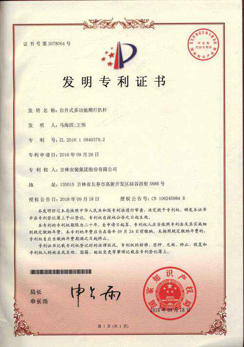 自升式多功能爬行扒桿發(fā)明專利證書(shū)