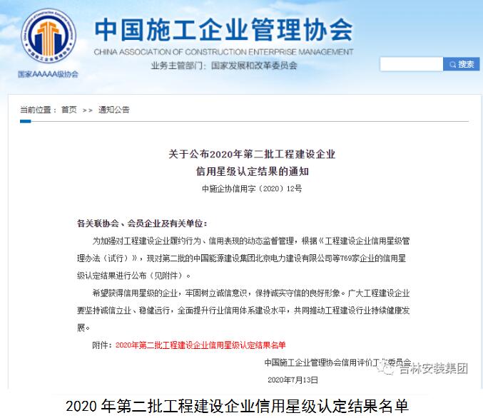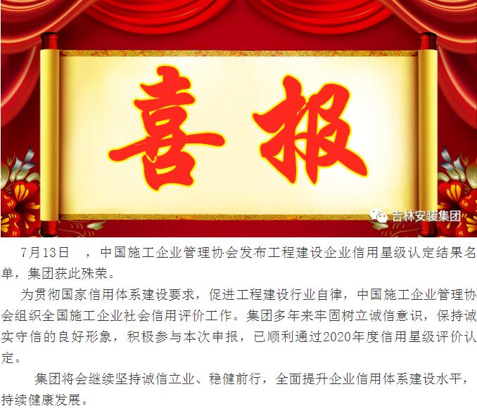 喜報:集團榮獲2020年度中國施工企業(yè)管理協(xié)會 信用星級認定