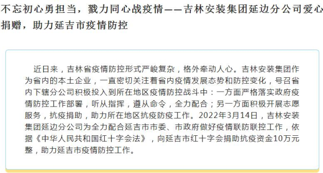 不忘初心勇?lián)?dāng),戮力同心戰(zhàn)疫情——吉林安裝集團(tuán)延邊分公司愛心捐贈(zèng),助力延吉市疫情防控 |
