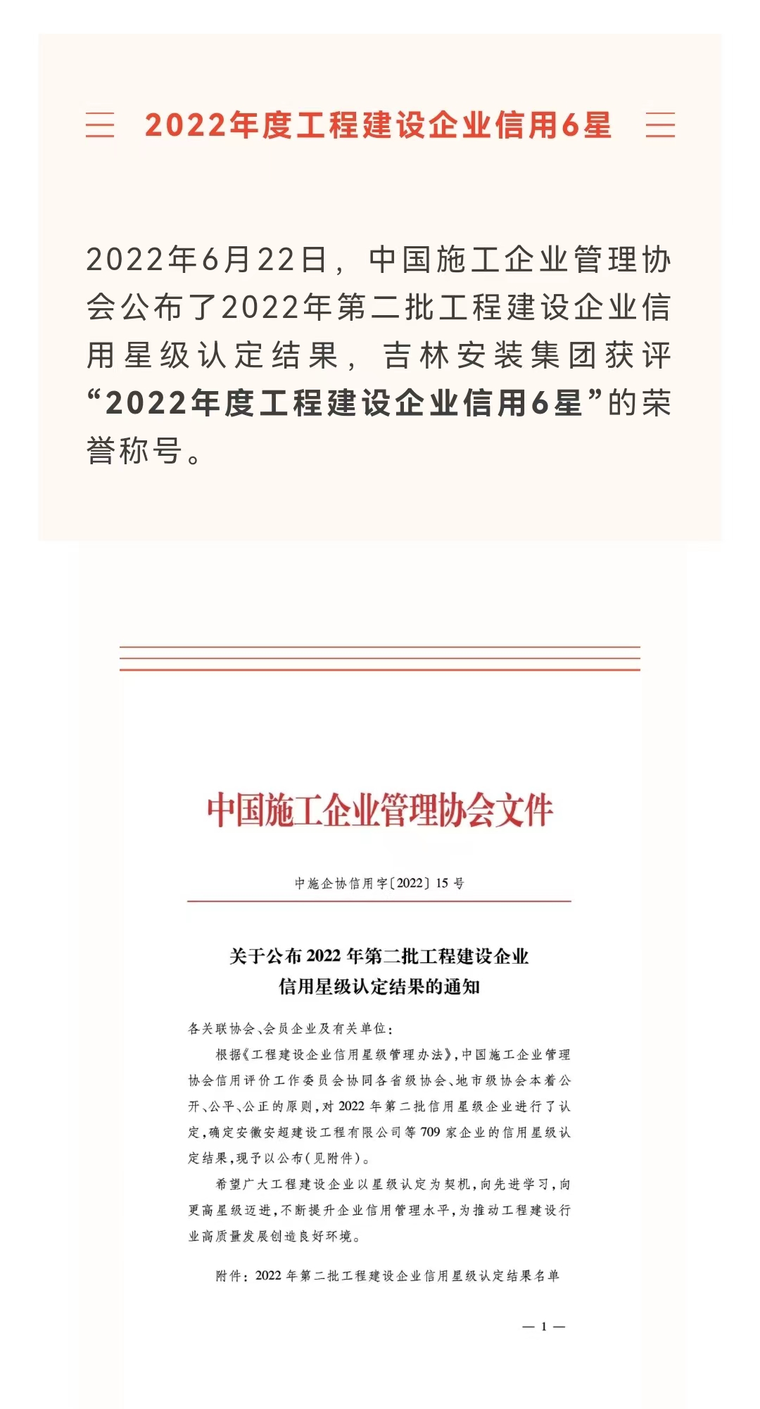 吉林安裝集團(tuán)獲評(píng)“2022年度工程建設(shè)企業(yè)信用6星”