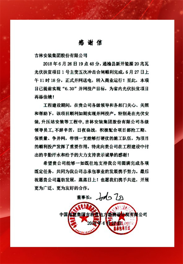 我集團承建的通榆縣新開能源有限公司20NW光伏扶貧電站項目建筑安裝工程(總包單位:中電建寧夏工程有限公司,合同開竣工日期:2018.4.29-2018.6.30)于2018年6月27日上午11時18分正式并網(wǎng)送電,提前實現(xiàn)了“6.30”并網(wǎng)投產(chǎn)目標(biāo)。 該工程參建的全體員工不辭辛苦、日夜奮戰(zhàn),積極配合總包單位保質(zhì)量、搶進度。16個區(qū)域、10200個灌注樁、3008組支架、檁條,1200組(每組22塊)面板全部安裝完畢,得到了建設(shè)單位和總包單位的高度贊揚,為我集團的光伏發(fā)電施工項目再添佳績。
