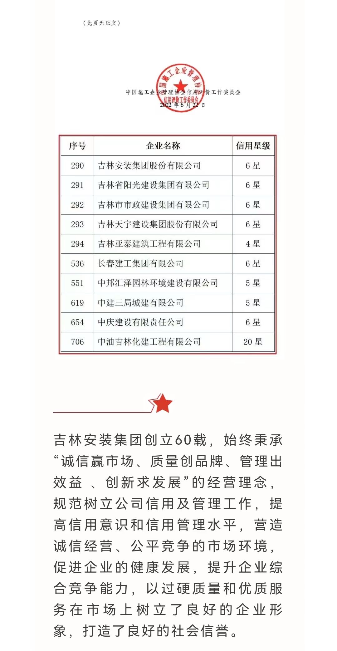 吉林安裝集團(tuán)獲評(píng)“2022年度工程建設(shè)企業(yè)信用6星”