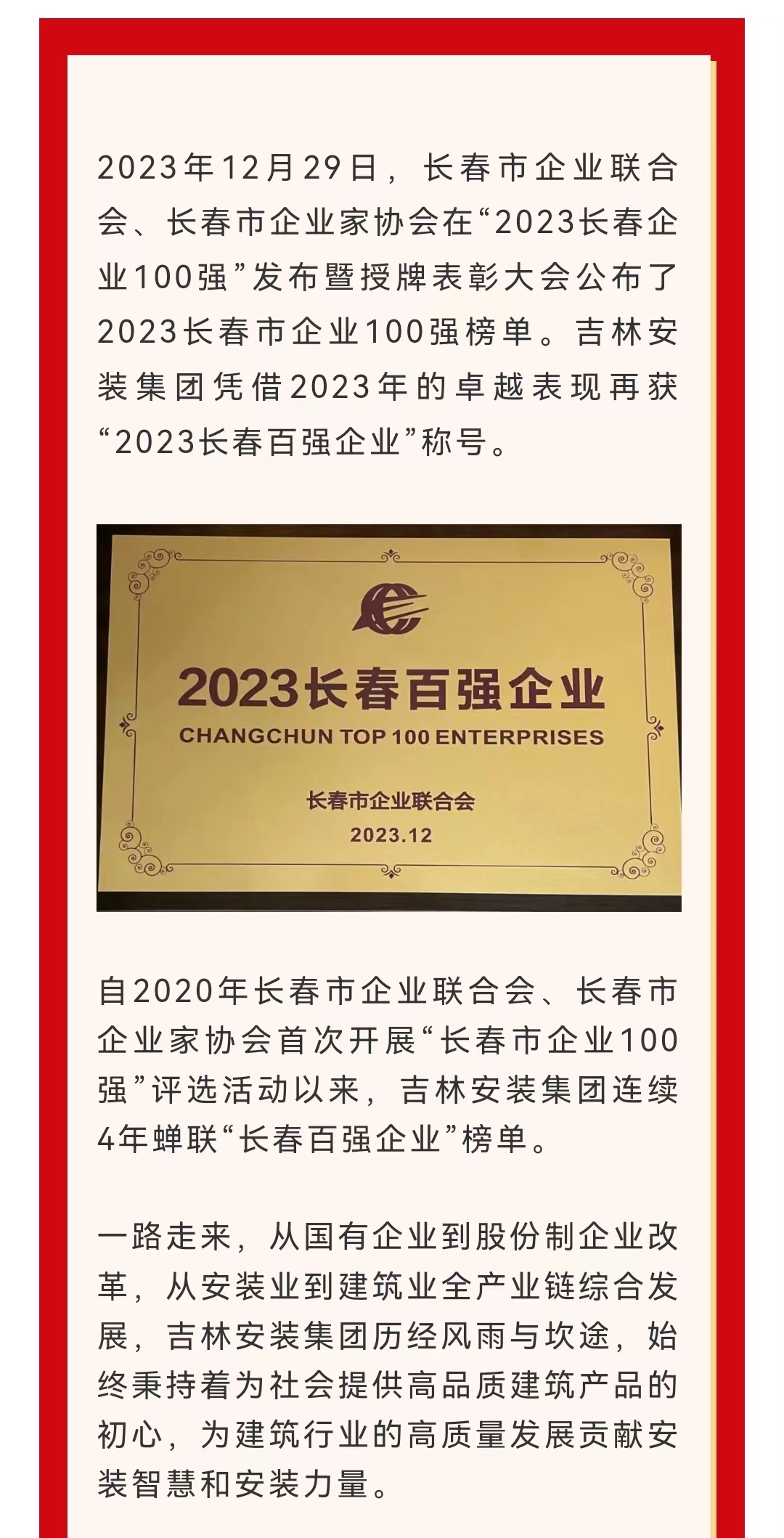 吉林安裝集團(tuán)再獲“長(zhǎng)春百?gòu)?qiáng)企業(yè)”稱號(hào)
